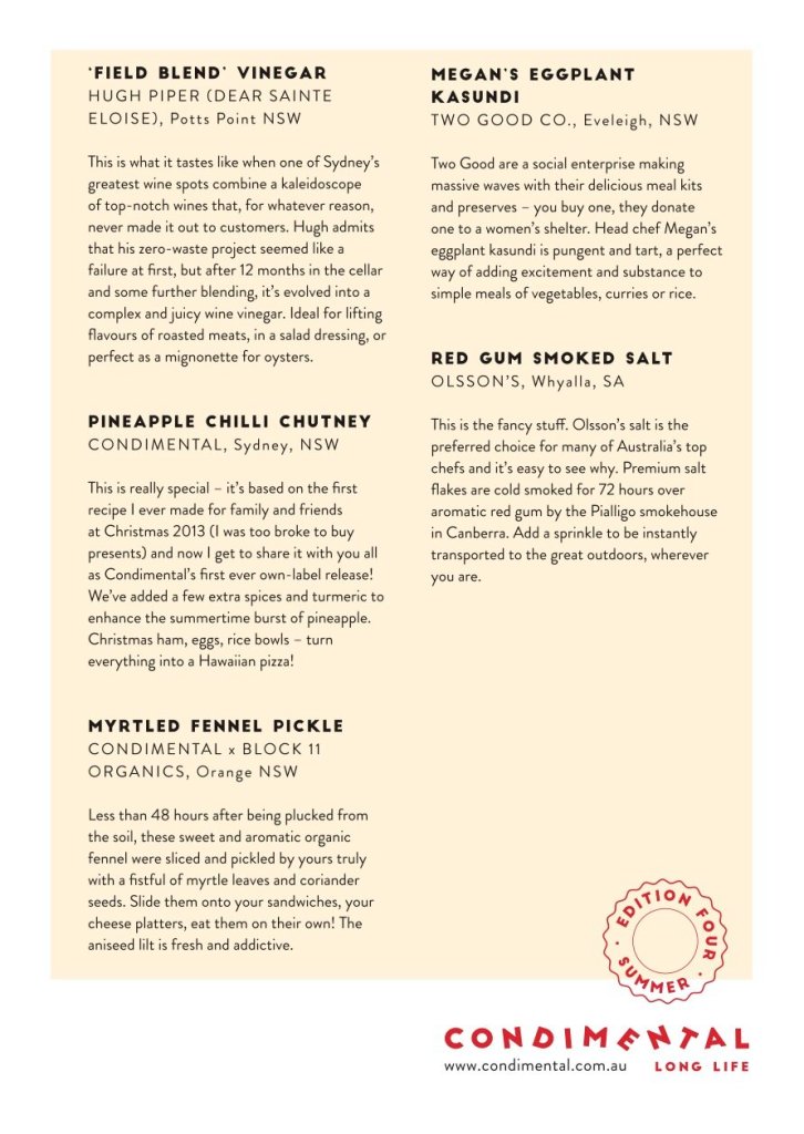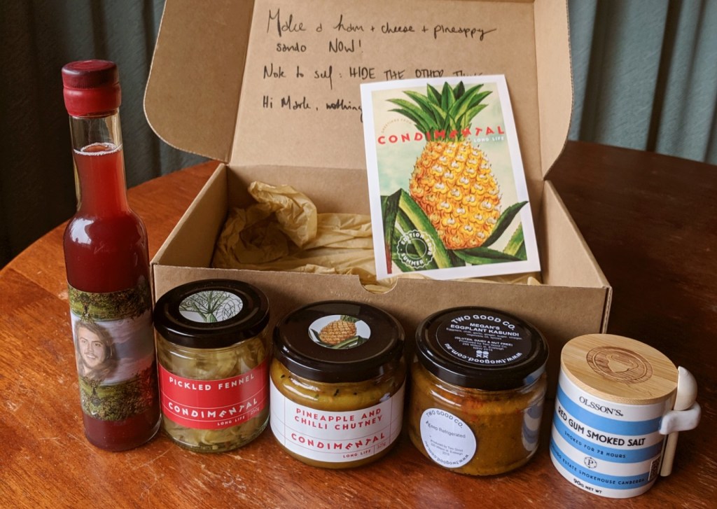 I couldn’t stop thinking about their ‘Summer Box‘ in particular. It’s the perfect mix of special and more everyday (only in use, not in quality!) items in my opinion. The Summer Box (the fourth curated box so far) includes these condiments: a red wine ‘field blend’ vinegar from Chef Hugh Piper at Dear Saint Eloise in Potts Point, Two Good Co head Chef Megan’s eggplant kasundi (a nice eggplant chutney of sorts packed with an Indian-style spice blend and flavour), pineapple chilli chutney by Condimental themselves (this one is a banger!), red gum smoked salt from Olsson’s in the cutest ceramic thingy with a lil wooden spoon (the smoky flavour is unreal), myrtled fennel pickle – another own brand creation from Condimental. I love Cornersmith’s pickled fennel, so I figured I’d be into a version with a lil’ sumthin’ sumthin’ extra.
